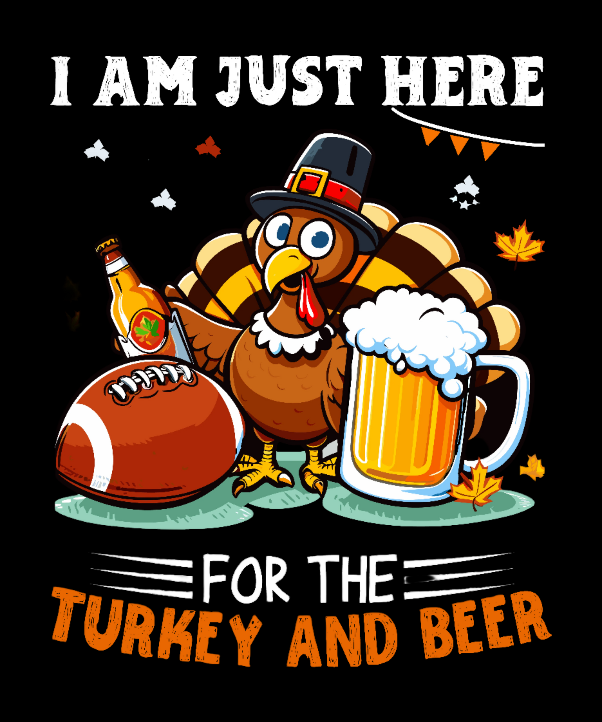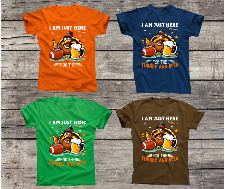 The "I Am Just Here for the Turkey and Beer" t-shirt allows wearers to proudly broadcast their hilariously simple holiday agenda in a lighthearted, good-natured way, inviting fellow revelers to join them in fully embracing the unapologetic indulgence that Thanksgiving was made for.